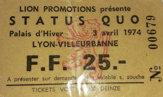 Premier concert de la tournée française de 1974, Status Quo joue devant 400 personnes seulement dans une salle pouvant en contenir près de 6 fois plus. Le cruel manque de promotion et la mort du président Pompidou seront à l'origine de cet échec. Au Printemps 1974, la formation londonienne est encore peu reconnue, en France. La sortie de l'album 'Quo' va inverser la tendance. 'Rock& Folk' et 'Extra' chroniqueront le concert.