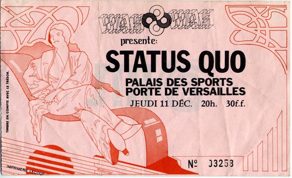 Il s'agit du troisième concert de l'année dans la capitale française et Rick Parfitt aura des problèmes avec son matériel. Robert Eilis mitraillera le groupe, toute la soirée. A l'issue du concert, dans les loges du Palais des sports, Status Quo recevra son premier disque d'or français pour les ventes de l'album 'Quo'.