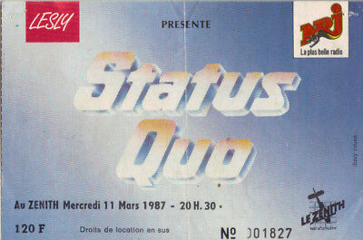 Le Zénith était plein à craquer, peut étre cette année là aurait il pu faire Bercy ? Le succés de "In the army now" y étant pour beaucoup. Et dans la salle celà se voie. On y voit beaucoup de jeunes personnes très propre sur eux, assurément peu préparer au déferlement de boogie qui bientôt les submergera. Leur allure dénote à côté du vrai fan, couvert de patchs au nom de son (ses) groupe(s) préféré(s). Mais Status Quo ce n'est pas le Top 50. Du coup j'ai vu nombre de ces jeunes gens quitter la salle avant la fin. Incroyable!!! Et de ceux qui sont resté, peu sont revenu les années suivantes, ce public étant très versatile par nature. En ce qui me concerne ce concert restera un bon souvenir, même si Alan Lancaster n'était plus là, et que je n'arrivais pas encore à me faire à son remplaçant que je trouvait particulièrement gauche sur scène. Il avait d'ailleurs failli s'étaler en trébuchant sur l'estrade supportant la batterie. Et puis sa coupe pétard qui lui donnait des airs de premier de la classe. Non à l'époque il n'avait vraiment pas la cote auprès de moi. (Michel)