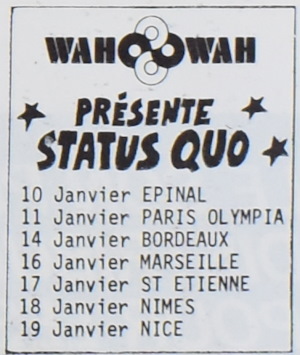 L'année 1975 aura droit à quatorze concerts (et quelques dates annulées en décembre), tous sous l'égide de Wah Wah Productions, maison de productions parisienne. La première salve de représentations se déroule du 10/01 au 19/01 et seront les dernières dates du 'Quo' tour débuté, le 6 mai 1974 à Bristol, en Angleterre. Le spectre en matière de fréquentation de la tournée 1974 envahit groupe et management lorsque, lors de la première date, à Epinal, seulement 200 personnes sont présentes au Parc des expositions. L'optimisme reviendra, rapidement, dès le lendemain, à l'Olympia de Paris qui sera sold-out et sur les dates suivantes où les fréquentations seront très correctes. Status Quo, dont la reconnaissance débutera, réellement, à l'été 1974 (avec l'album 'Quo' et le single 'Break the rules', bien classé au hit-parade RTL) attire, dorénavant du monde aux concerts (Près de 15.000 personnes sur les 8 dates de janvier). Ce nouveau statut séduit les producteurs français, notamment, Jumbo Concert qui n'hésite pas à faire appel, en catastrophe, à Status Quo, pour assurer le remplacement du groupe américain, Mahavischnu Orchestra qui a annulé ses concerts de Colmar, le 11/02 et de Grenoble, le lendemain. Devant l'immense popularité dont jouit, dorénavant, la formation londonienne, un nouveau concert est organisé, au cœur de la tournée 'On the level' tour, le 02/06 au Palais des Sports de Paris. Un immense succès populaire avec 4.600 personnes confortent les promoteurs français qui remettent le couvert, pour sept dates en décembre. Malheureusement, cette fois-ci, même si le Palais des Sports de Paris est plein comme un œuf, le 11 décembre, seules deux autres dates (Grenoble et Saint-Etienne) seront assurées. Les prétentions financières de Status Quo étaient-elles à l'origine de ces annulations ? La question ne sera pas élucidée mais le management du groupe rejettera, sans réserve, les causes de ce dysfonctionnement sur les organisateurs français. Néanmoins, tout ceci n'empêchera le groupe d'avoir joué devant près de 29.000 personnes.